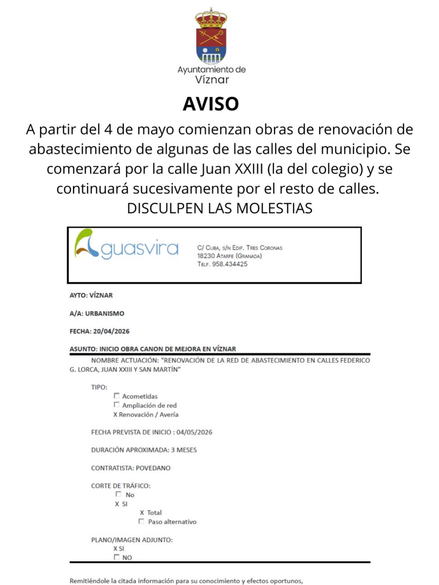Aviso comienzo de obras de renovación del abastecimiento de algunas de las calles de municipio